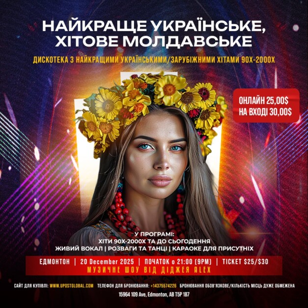 ДИСКОТЕКА 90-х–2000-х В ЕДМОНТОНІ Найкращі українські, молдавські та світові хіти 20 грудня 2025, Едмонтон Неймовірне шоу від DJ Alex Поринаємо в атмосферу улюблених пісень: – хіти 90-х, 2000-х і до сьогодення – живий вокал – розваги та танці всю ніч – караоке для всіх бажаючих – легка закуска для присутніх Бронювання обов’язкове – кількість місць дуже обмежена! 🎟 Квитки: Онлайн – 25,00 $ (visa, mastercard, paypal) На вході – 30,00 $ (cash) 📅 Дата проведення: 20 грудня 2025 Адреса : 15964 109 Ave, Edmonton, AB T5P 1B7 📞 Телефон для бронювання: +1 437 557 4226 🌐 Квитки онлайн: Слідкуй за нами: instagram: Community_ukraine facebook: Community_ukraine Організатор заходу: міжнародна логістична компанія uPost Global